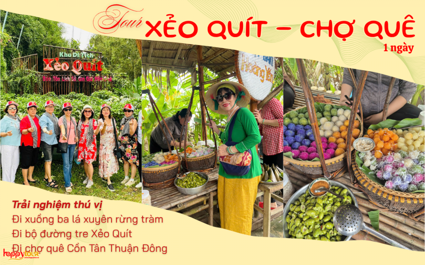 - Vé tham quan 1 lượt: Khu di tích Xẻo Quýt, Chèo xuồng ba lá, Tàu du lịch qua cồn Tân Thuận Đông khứ hồi.