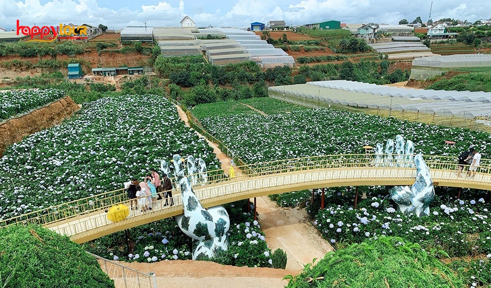 - Cánh Đồng Hoa Cẩm Tú Cầu - với tiểu cảnh Cầu Vàng Đà Lạt là phiên bản mini của Cầu Vàng Đà Nẵng. Điều kiện địa hình ở đây không cho phép thực hiện một cây cầu “sao y bản chính”. Vì thế, phiên bản nhỏ hơn nhưng vẫn giữ được tinh thần và vẻ đẹp của Cầu Vàng Đà Nẵng. Đặc biệt, khi lên ảnh, cây cầu vẫn toát lên được sự hoành tráng và chất thơ, đẹp mộng mơ không kém gì phiên bản gốc.
