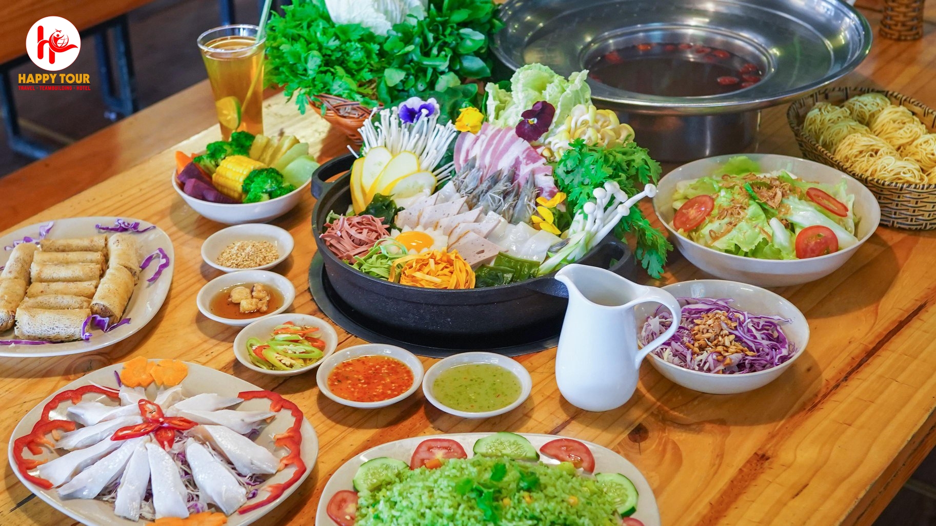- 04 bữa ăn chính: Thực đơn 5 món: 01 bữa cơm niêu, 02 bữa ăn set menu, 1 bữa buffet lẩu rau.