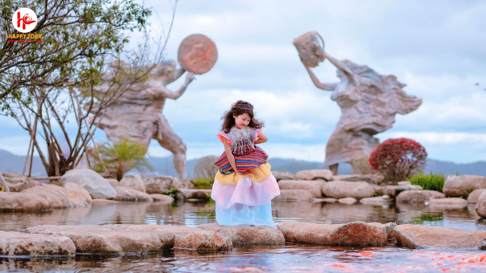 - Tượng "Vũ điệu Langbiangland" trên hồ vô cực tái hiện hình ảnh chàng trai K’ho gõ chiêng và cô gái K’ho nâng gùi lúa vàng trong điệu múa truyền thống
